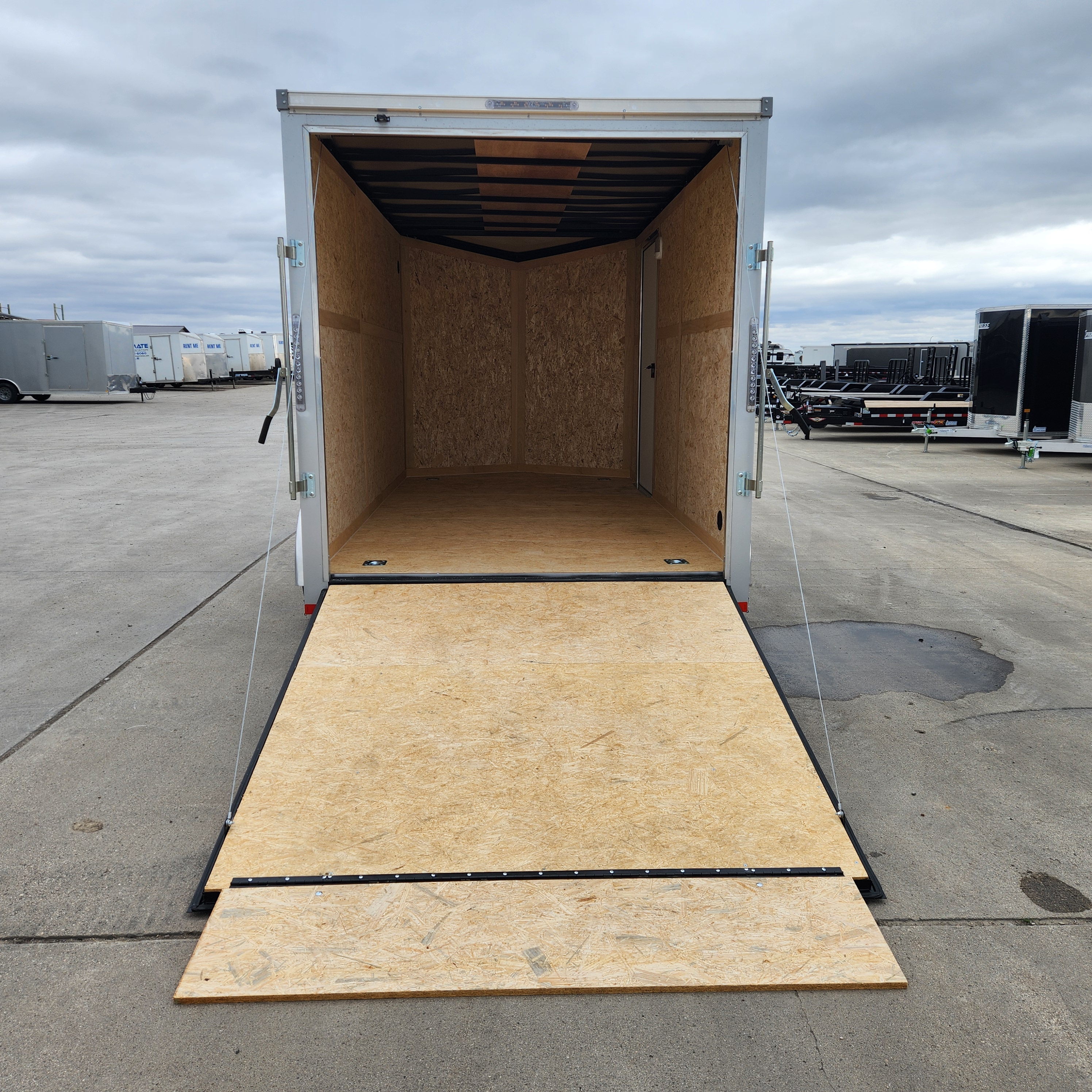 Ramp Door, 6" Extra Height (7' Interior), Sloped V Nose, Set Back Jack, 16" OC Walls, Screwless Exterior, 3/8" Engineered Walls, 4 D Rings