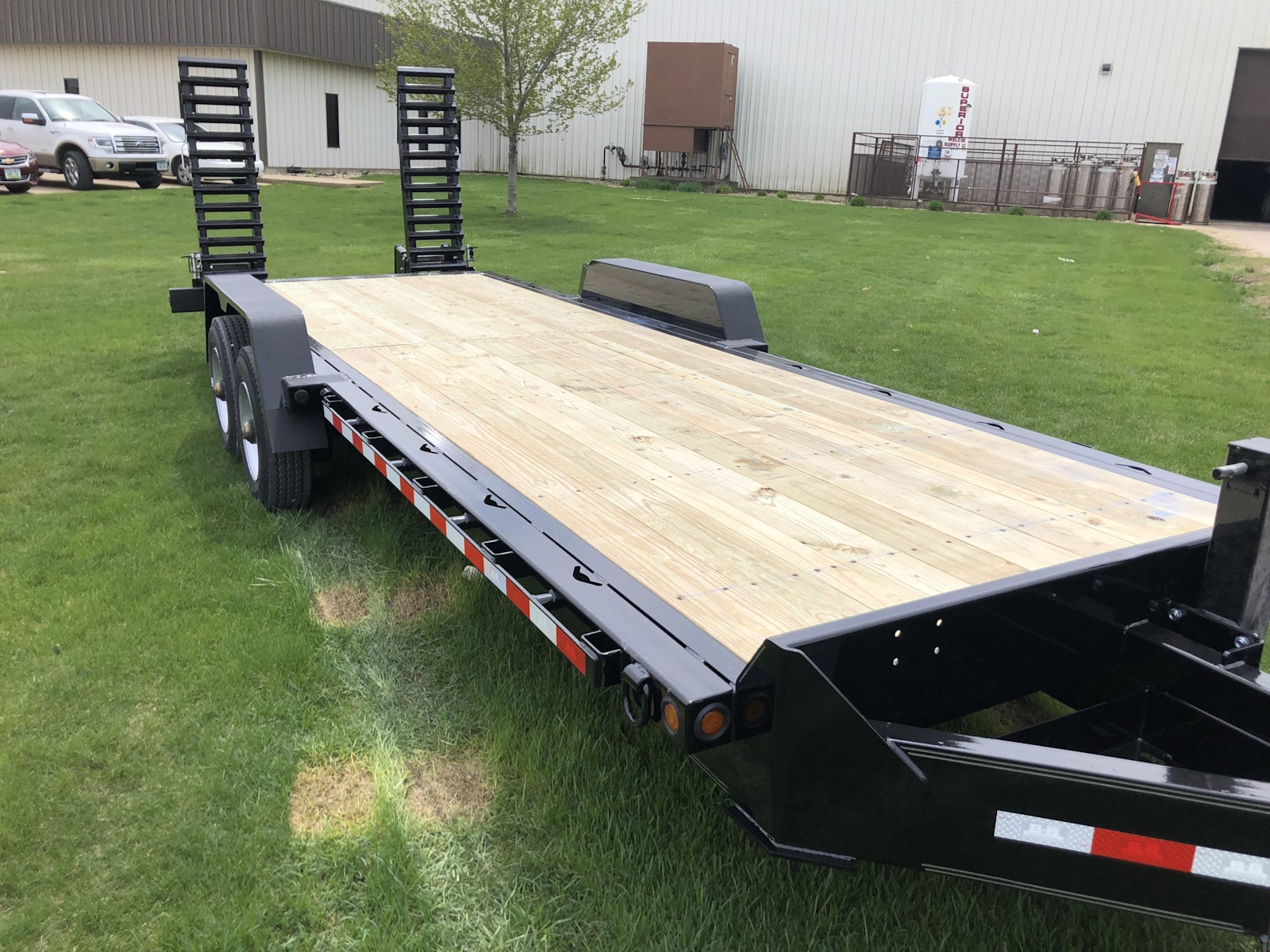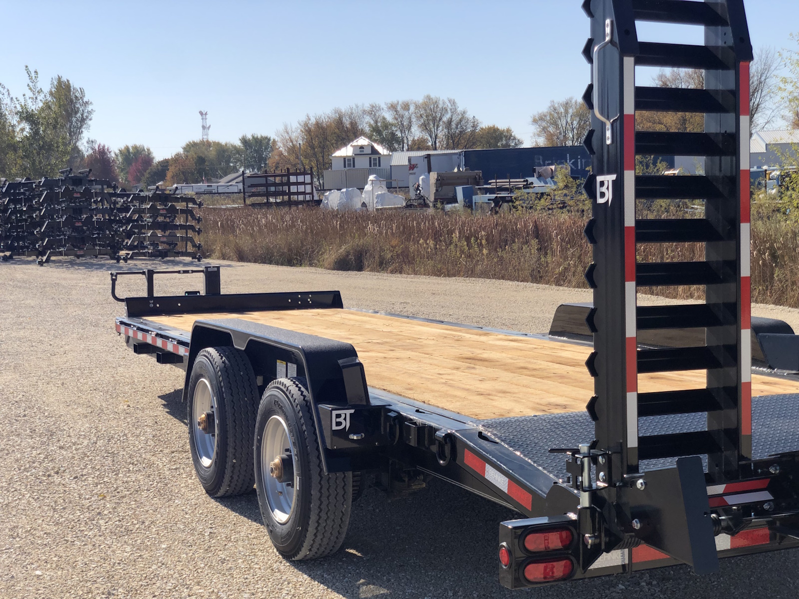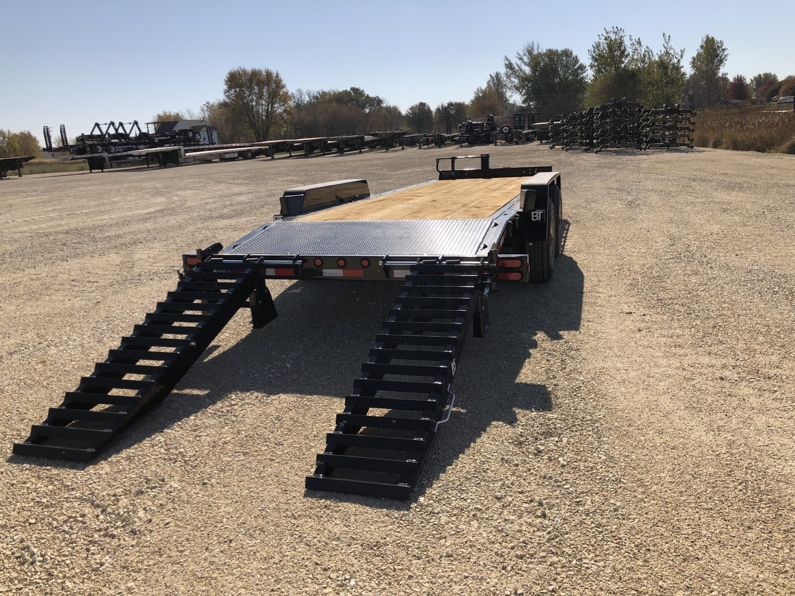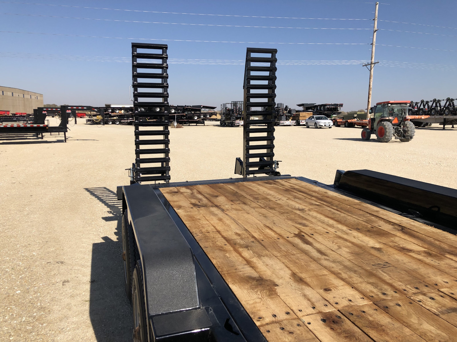 The 24,000 lb. GVW HD channel equipment trailer is a monster, it comes standard w/ (2) 12,000 lb. electric brake axles and is built out of a heavy 10" x 20 lb. continuous channel frame. This trailer is also equipped with 17.5 super single tires to handle the heavy loads it can haul. There is a full 83" between fenders and fender guards also come standard on the 24K HD model to help guide skidloader buckets in between the fenders. Standard tie downs include D-rings and chain slots to tie-down heavy equipment. Pull-type and gooseneck configurations are available.